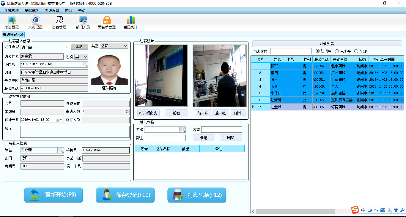 由于每天來訪的訪客較多,深圳證監局啟用了研騰訪客登記管理系統,所有來訪人員需出示身份證到訪客管理員那里登記信息,把身份證放在身份證讀卡器上,網頁上自動讀出來訪人員的身份信息,然后說明來訪理由,對著攝像頭拍照,訪客管理人員打印出訪客單,訪客拿著訪客單就可進入辦理業務了。